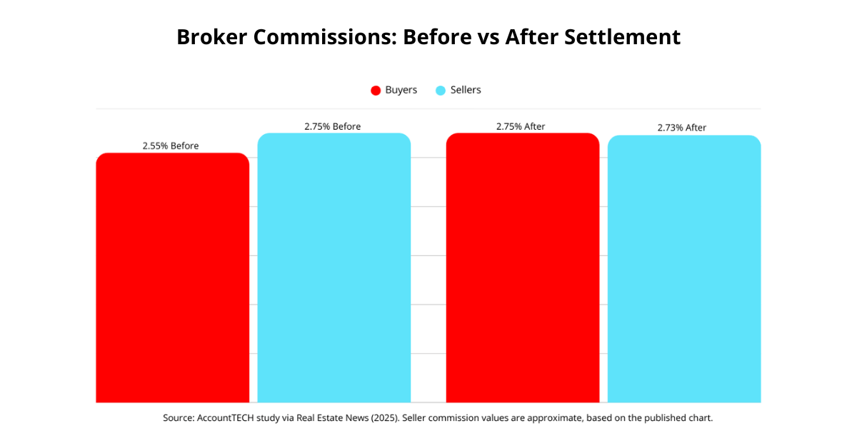 News coverage summarized the change by saying buyer commissions rose only slightly, from around 2.50% before the settlement to 2.55% a few months later, while seller commissions slipped from about 2.80% down to 2.73%.