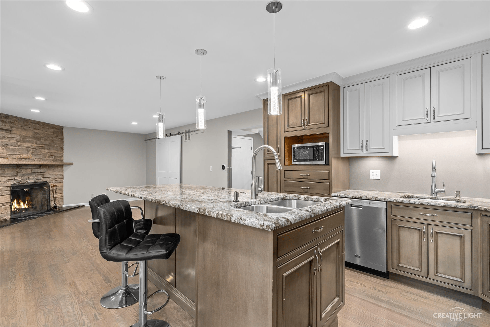 The modern kitchen, renovated in 2019, features two-toned Haas cabinetry, undercabinet lighting, soft-close doors and drawers, and granite counters with an oversized center island perfect for casual dining.