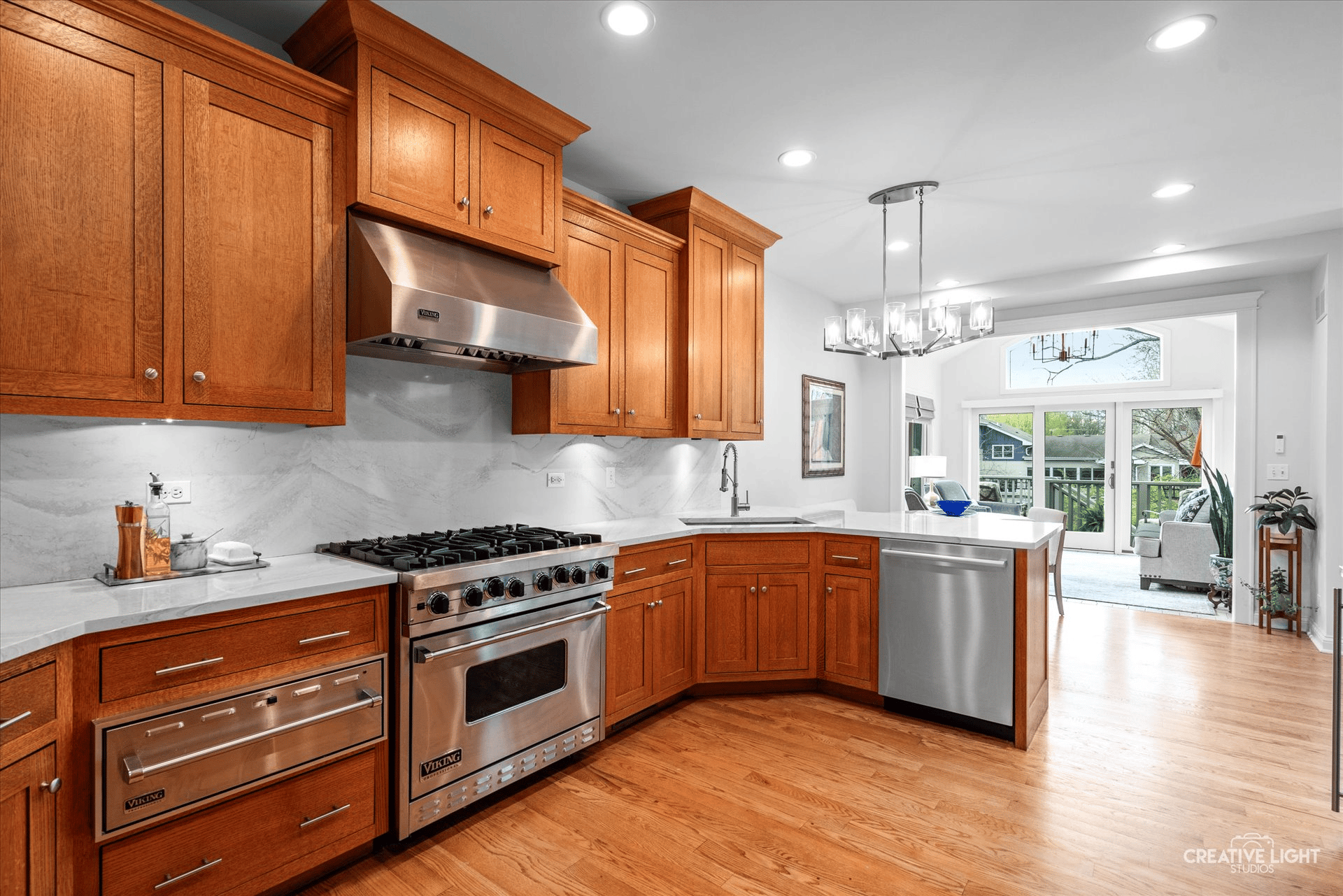 Inside, the home has been freshly painted from top to bottom, including all trim work, and every recessed light has been updated for a clean, modern look. A dramatic designer chandelier sets the tone in the dining area, while the living room features floor-to-ceiling windows and a striking stone fireplace that anchors the space with warmth and character. The kitchen has been thoughtfully upgraded with quartz countertops and backsplash, a Bosch dishwasher, updated hardware, under-cabinet lighting, and premium appliances including a Viking range and SubZero refrigerator.