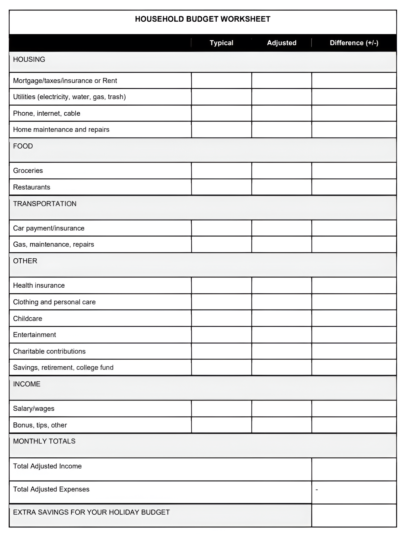 For example, here’s a sample budget worksheet that we created. Start by adding in your expenses: Under the “Typical” column, you can list your standard expenses, and under the “Adjusted” column, list any areas where you could cut back on spending.