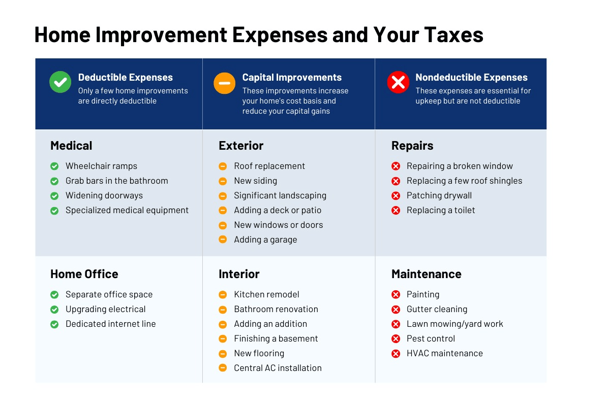 You can’t usually deduct home improvement expenses directly. However, the money you spend on capital improvements (improvements that increase your home’s value) can help reduce your tax bill later. These expenses are added to your home’s “cost basis,” which reduces your capital gains tax when you eventually sell the house. Think of it this way: by keeping records of your home improvements, you’re essentially increasing the “price” you’re considered to have paid for your home, thus lowering your profit when you sell.