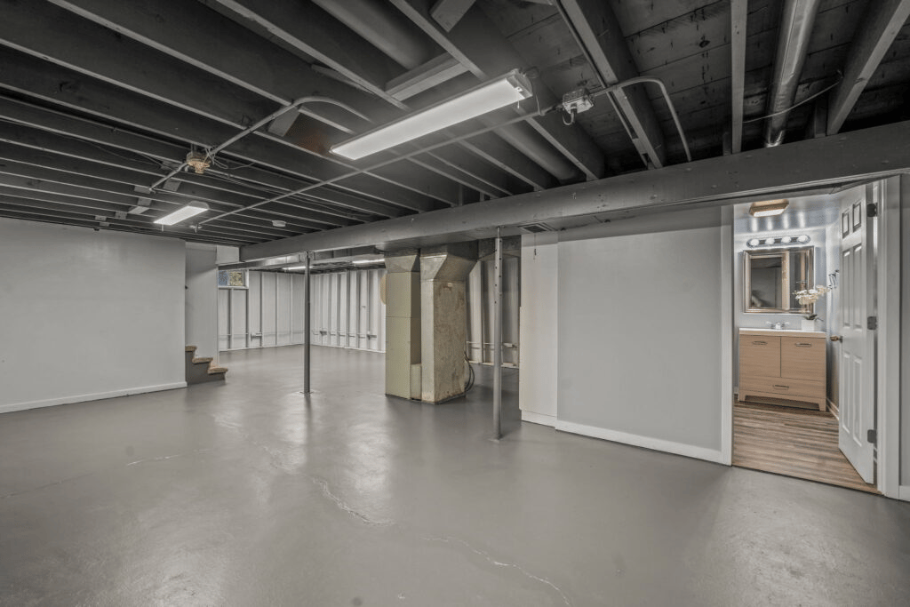 The full basement is clean and dry. Laundry time will be a pleasure in this space, too! Loads of cabinetry to store all the laundry essentials plus drying rack and hanging rod.