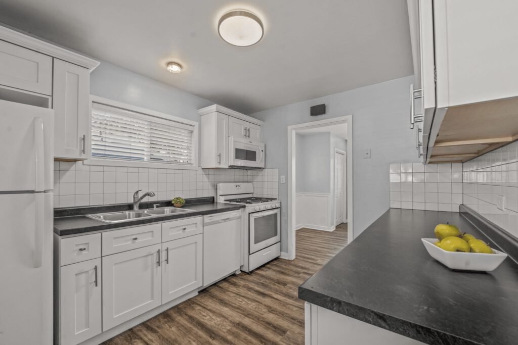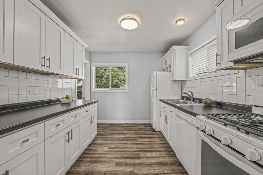 The kitchen is bright, white, and airy with top-notch quality, shaker cabinets that you see in the most expensive homes. Supreme Craftsmanship is evidenced by dovetail joinery, full extension & soft close drawers on the lowers and soft close & crown molding on the uppers.
