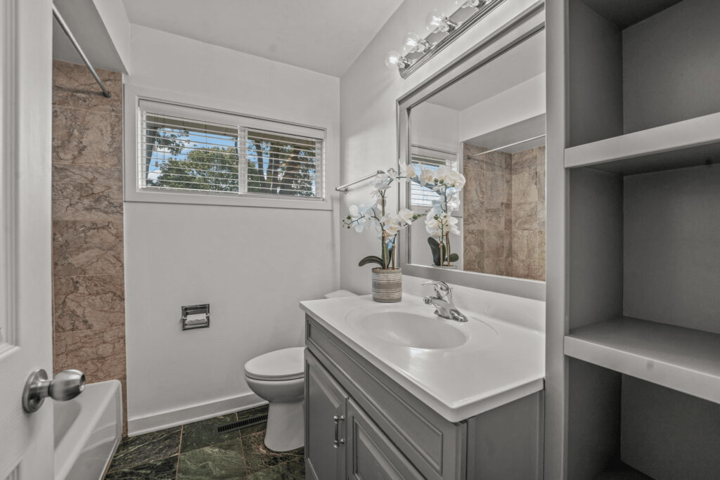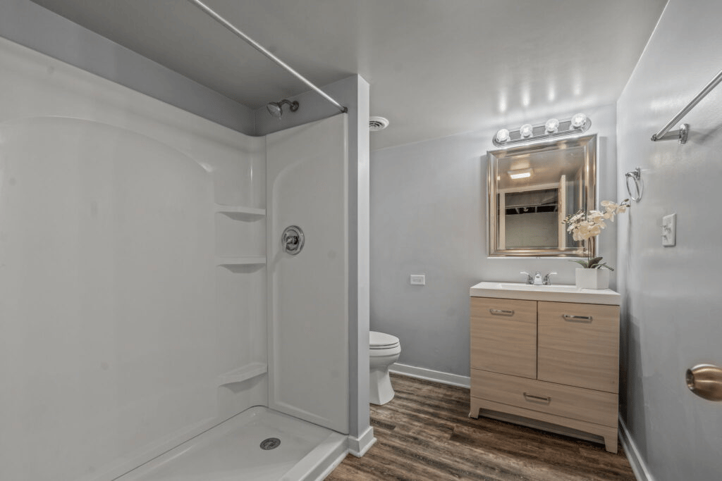 For added convenience and functionality, an elegant second full bath with step in shower, contemporary vanity and mirror was installed.