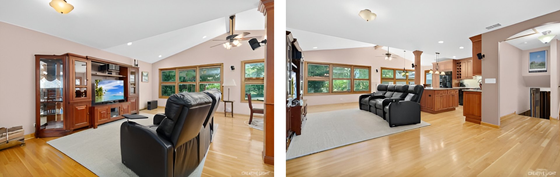 The open-concept layout allows the hardwood floors to flow from the kitchen to the living and dining areas, where you’ll find a full masonry wood-burning fireplace for cozy evenings. Immerse yourself in cinematic experiences with Bose surround sound speakers and relish the comfort provided by new Casablanca ceiling fans.