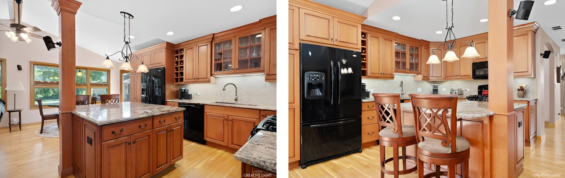 Step inside and be captivated by the elegance of the addition completed in 2008. This expanded living space features a vaulted and beamed ceiling, seamlessly merging with the new kitchen that’s a chef’s dream. Adorned with custom maple cabinets boasting dovetail joinery and soft-close drawers, granite counters, and GE appliances including a 5-burner gas cooktop, convection microwave, and under cabinet lighting, this kitchen is as functional as it is beautiful.