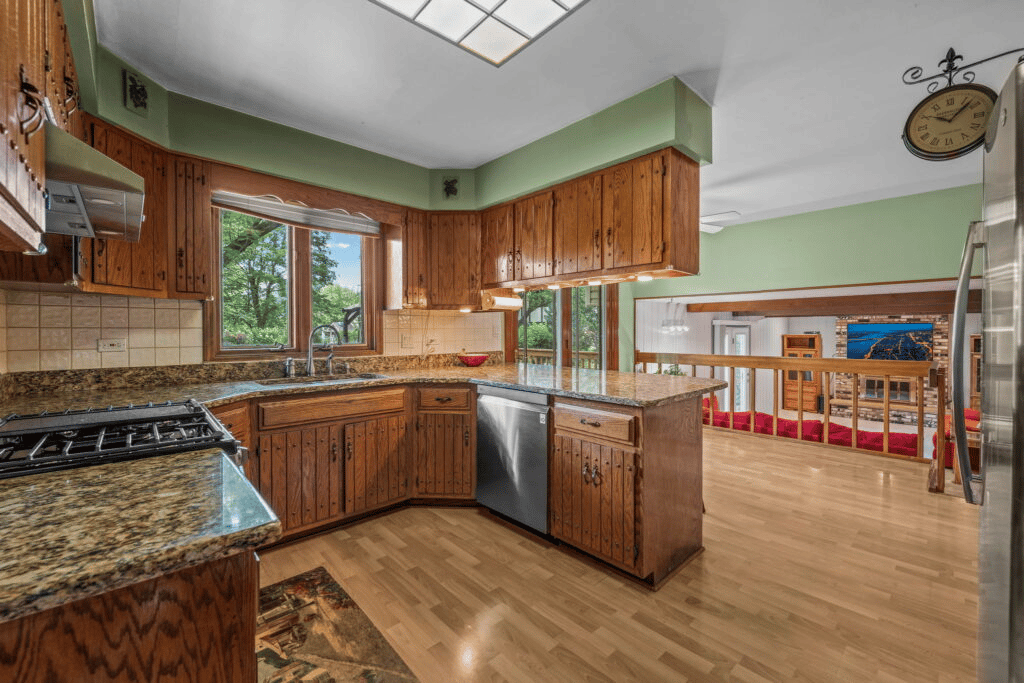 Kitchen improvements include new stainless gas range & hood 2022, newer stainless refrigerator 2019 & dishwasher 2020, garbage disposal 2021, granite tops, activity desk and peninsula with breakfast bar.