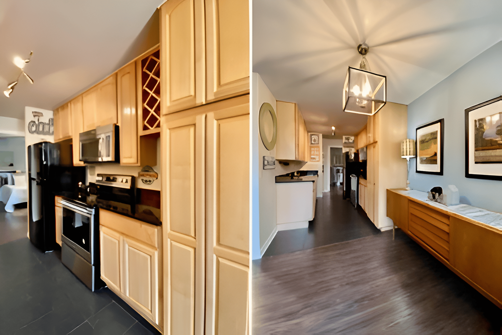 Gorgeous kitchen improvements adding 42″ honey-toned cabinetry with a pantry and customized wine storage were added in 2017 along with shimmering black granite counters that exude luxury and contrast beautifully with the cabinetry. The kitchen appliances have all been updated since 2019.