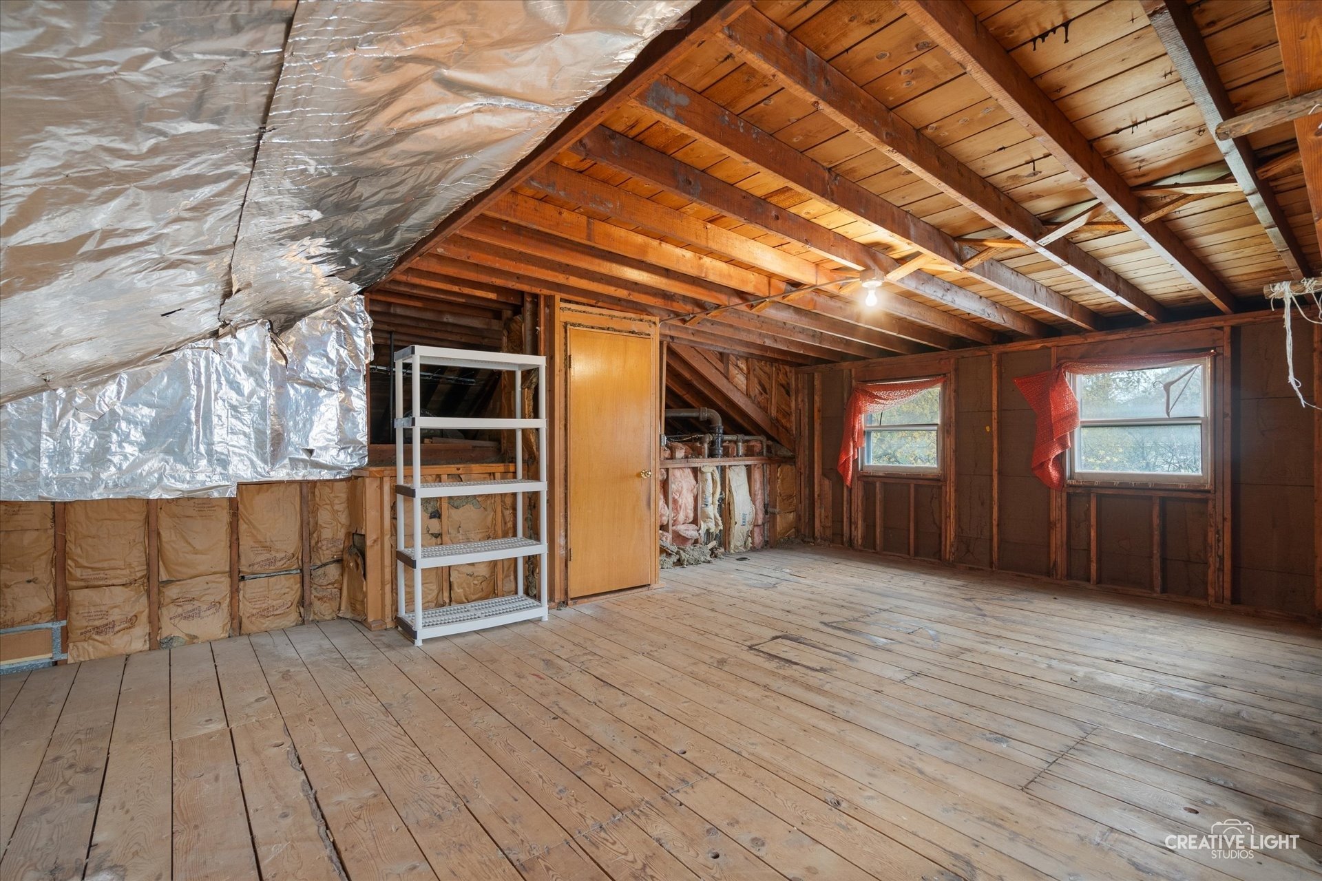 Inside, the home features three bedrooms and two full baths, including a newer walk-in shower in the lower level. The vintage kitchen adds charm with its classic range, and both front and rear porches have been upgraded with durable composite decking. Hardwood flooring is under the foyer and living room floors as well as in all three bedrooms. One of the most exciting features is the walk-up unfinished attic space, already equipped with a water source. It’s an incredible opportunity to build out a spacious new primary suite, home office, or playroom—adding significant value and livable space to the home.