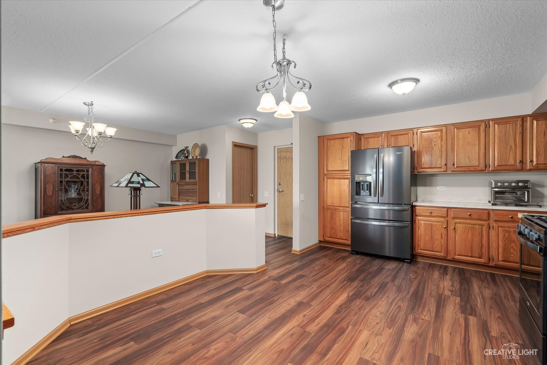 Wait till you see the size of this kitchen! Abundant cabinet and counter space. Organization will be a breeze with plenty of room to store away neatly, everything you need. Plus new durable, luxury, vinyl plank flooring, a large pantry cabinet, new stainless Whirlpool appliances, and chandelier lighting.